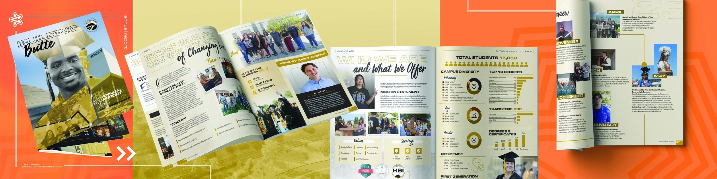 In another collaboration with Creative West Graphic Solutions, this project uses preexisting and newly formulated branding to create a 28-page printed booklet that will be mailed to the public, highlighting new processes, programs, and physical growth within the school and out. It was integral to visually emphasize rising graduation rates & data, student achievements, and EOPS (one of Butte’s biggest support programs) 55 year celebration, making a exciting and informationally digestible collection of works.