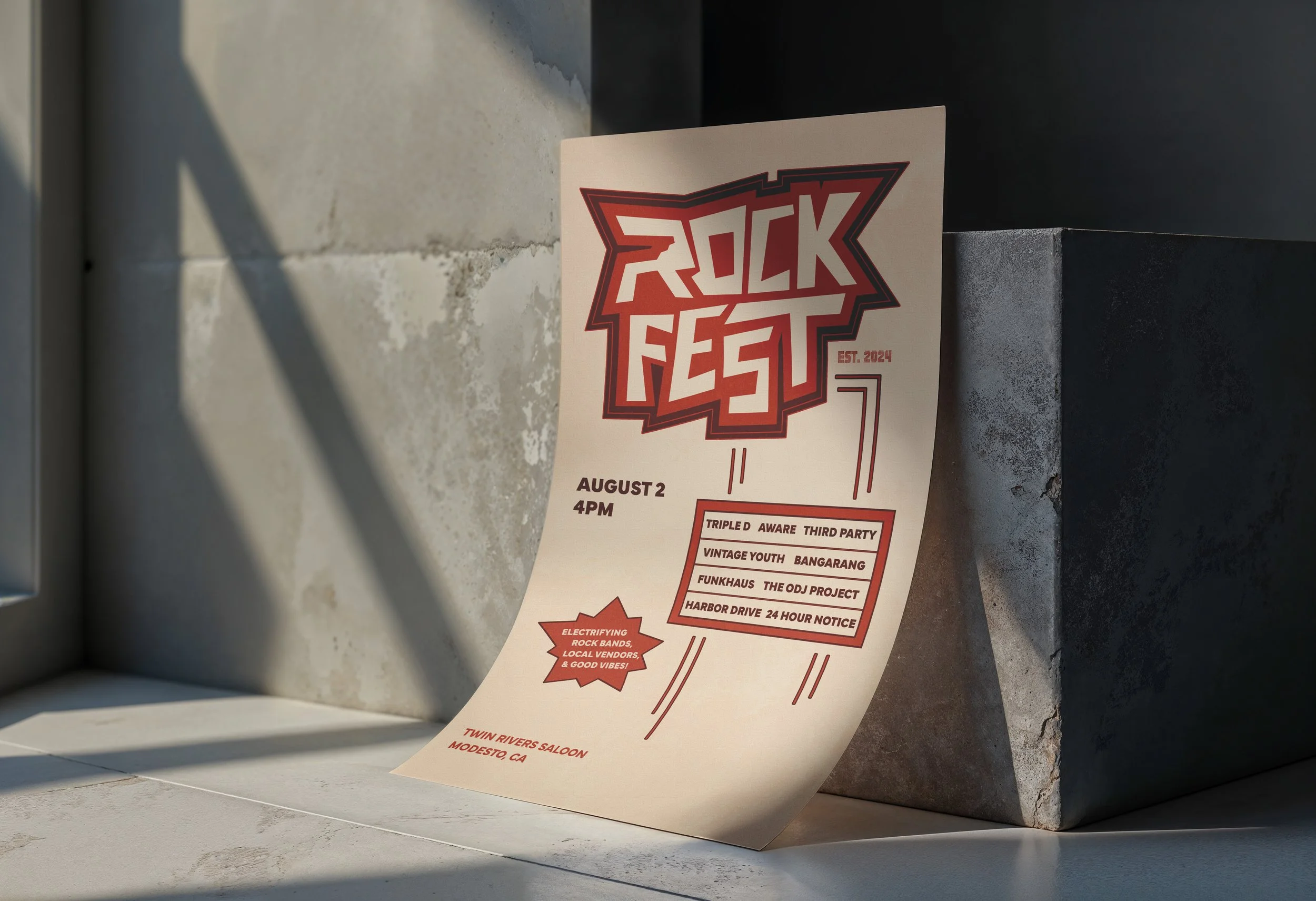 Into the second year of Rockfest, it was apparent that creating a visual identity would help the festival become a staple in the Modesto community. Hosted at Twin Rivers Saloon alongside California Highway 132 and with its roots in hosting notable country acts, it was important to have location and its history sprinkled into Rockfest’s identity. Through research, using elements on vintage americana best fit the location and tied into one of the festivals messages of freedom and unity.